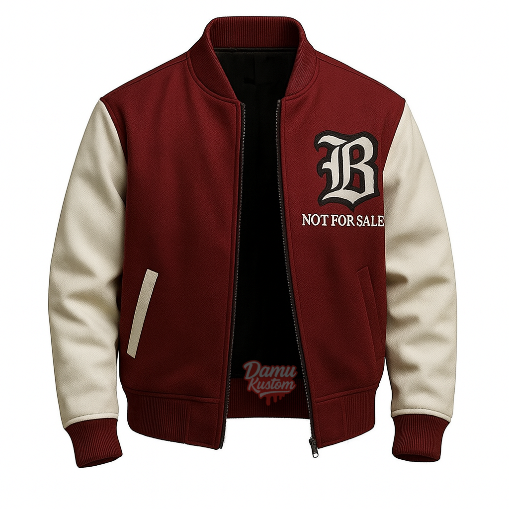 Elevate your streetwear game with the B Not For Sale Varsity Jacket, a bold statement piece blending luxury design and timeless varsity style. Crafted in rich burgundy wool-blend fabric with smooth cream sleeves, this jacket features a detailed Gothic “B” embroidery and “NOT FOR SALE” lettering on the chest — a symbol of authenticity, pride, and self-worth.