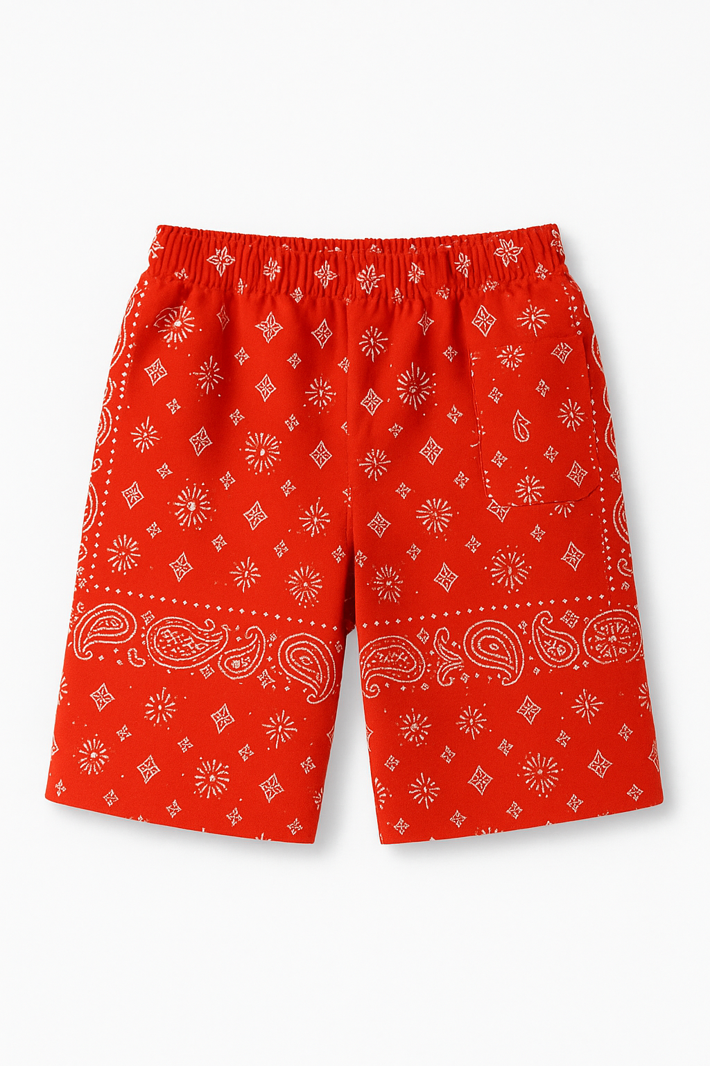 Stand out with effortless street-style in this vibrant bandana print outfit. The set includes a short-sleeved button-up shirt, matching drawstring shorts, and a bucket hat — all crafted with bold paisley patterns for a modern urban edge.