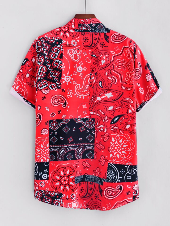 Step out in bold street-style confidence with this red paisley bandana print shirt. Crafted from lightweight, breathable fabric, this short-sleeve button-up shirt features a striking red base with black and white paisley patchwork patterns for an effortlessly edgy vibe. Styled open over a plain white tee and paired with a silver chain pendant, it gives off that perfect blend of casual and urban fashion energy. Ideal for summer outings, concerts, or a laid-back day out — this shirt adds instant attitude to any look.